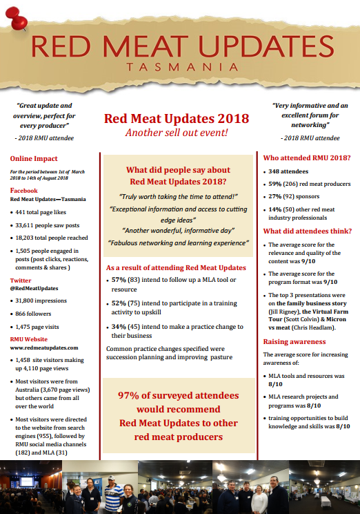 Red Meat Updates 2018 was held on Friday, 27 July in Launceston. The day attracted over 350 people from Tasmania’s red meat industry, with the event selling out two weeks in advance. Feedback from attendees and sponsors was very positive.