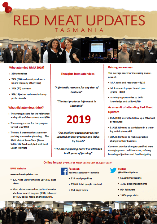 Red Meat Updates 2019 was held on Friday, 26 July in Launceston. The theme for the event was ‘Getting down to business’ and the day showcased presentations focussing on business and people management. The day sold out weeks in advance and attracted over 350 people from the Tasmanian red meat industry.